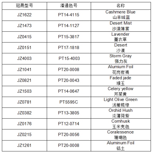 我司推出新品,JZ建築藝術係列91大香蕉视频。其色號說明 :JZXXXX是在建築色卡的色號前加上JZ成為我司的色號,後麵的PT色號是此顏色對應的潘通色號。
